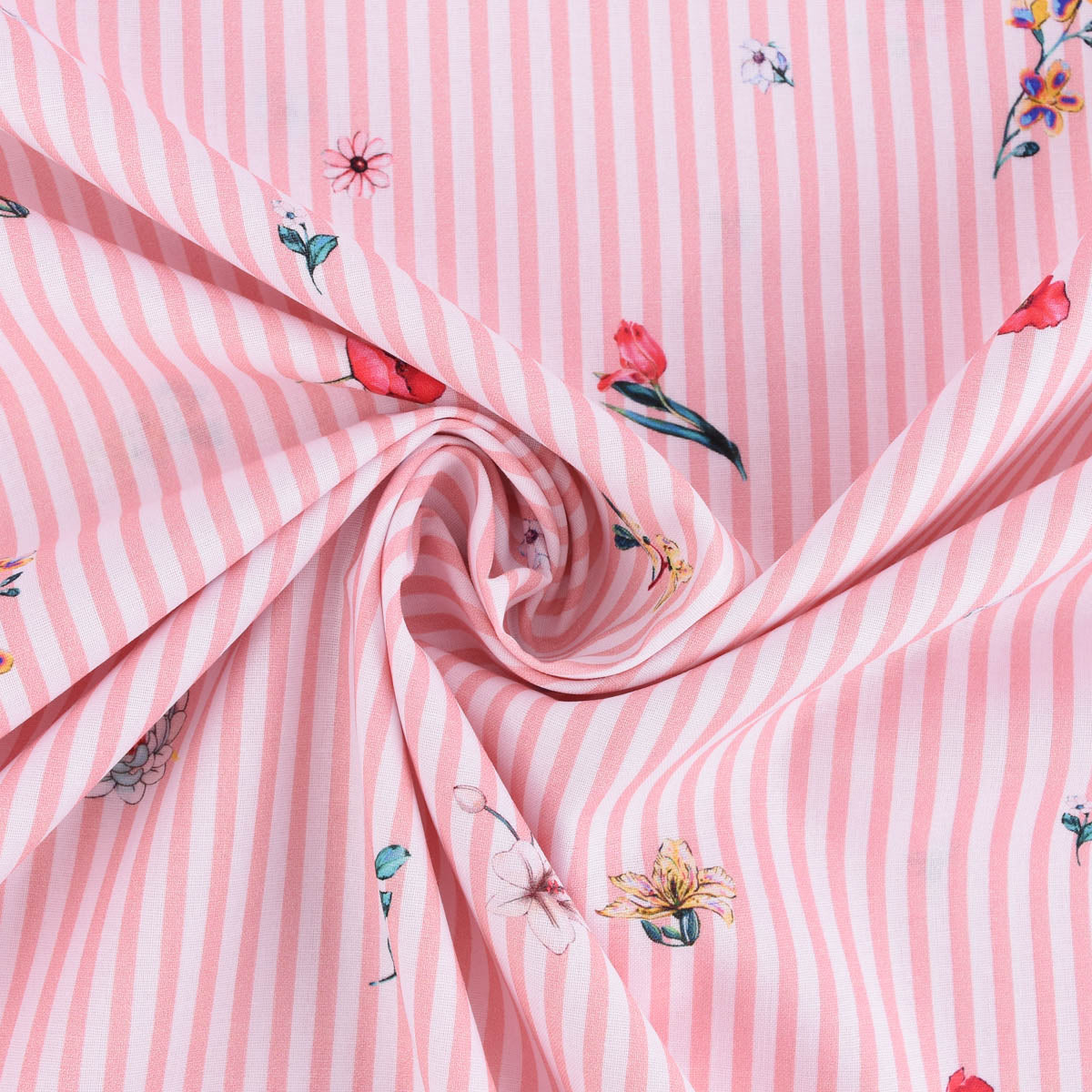 Baumwollstoff Popeline Digitaldruck mit Streifen und Blumen, rosa